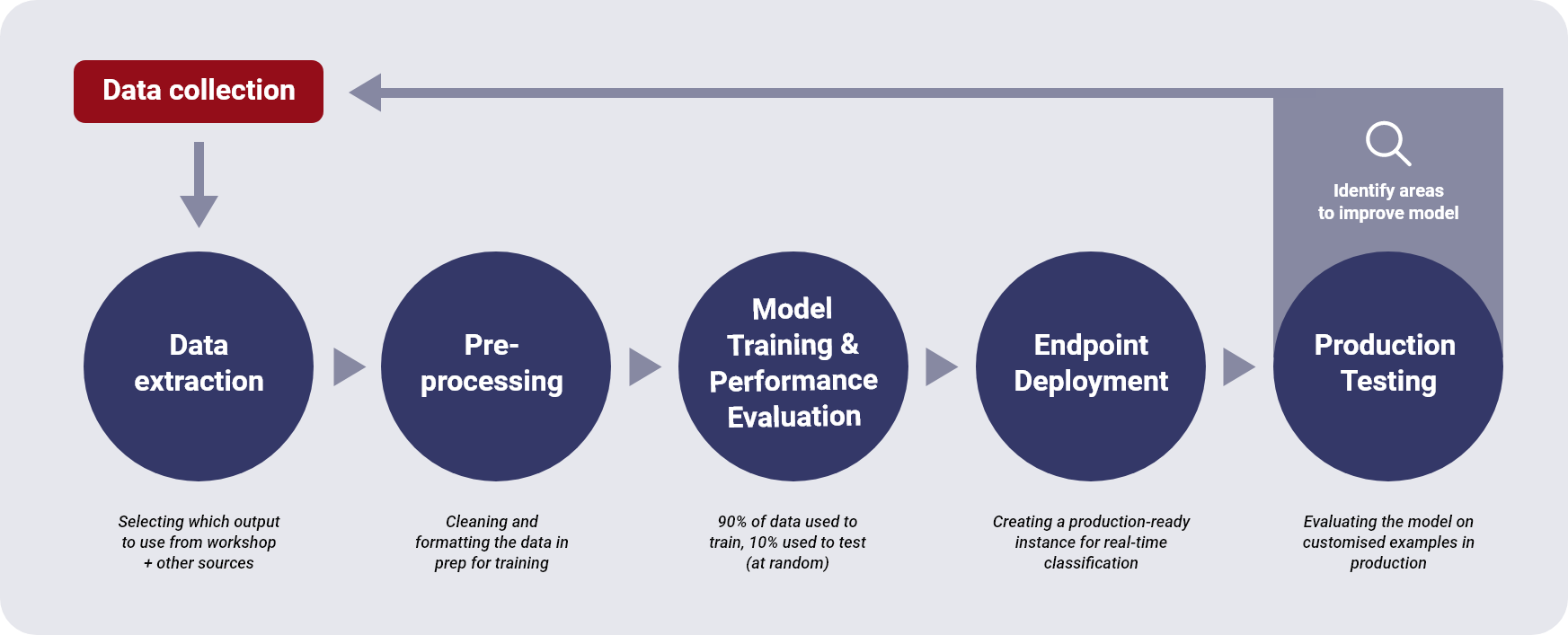 - Model Training & Evaluation: Data scientists trained a custom incitement classifier on Amazon Comprehend, using an ML Ops methodology. Performance was iteratively evaluated using 90% of the data for training and 10% for testing. Results were categorised on a RAG scale.